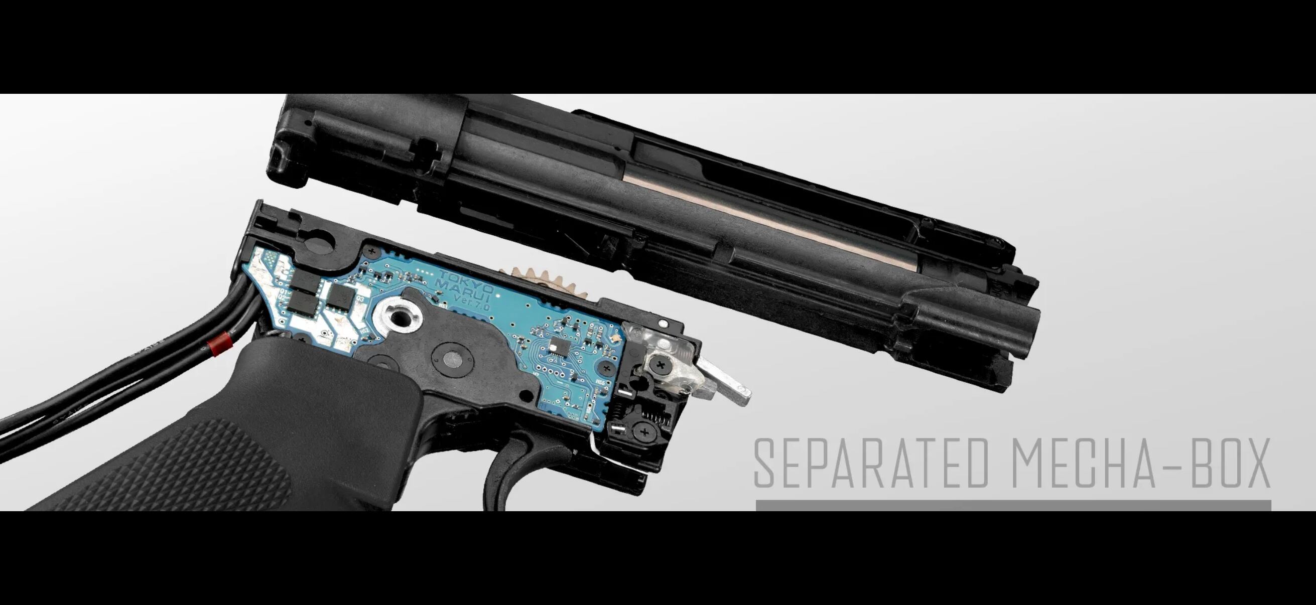 メカBOXを「シリンダーアッシー」と「ギアBOX」に分割したことで、アッパーレシーバーとロアレシーバーが完全に分離。電動ガンでありながら、リアルなテイクダウンが可能になりました。