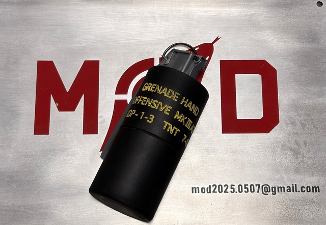ベトナム戦時、使用されていたオフェンシブ(攻撃)グレネードのダミーレプリカとなります。 【MK3A2攻撃手榴弾について】 MK3は、M67のような破片手榴弾(防御手榴弾)ではなく、攻撃手榴弾として設計されている。すなわち、TNT爆薬の爆発により発生した衝撃波によって敵兵の無力化(殺傷)もしくは制圧を狙った設計になっている。金属片を広範囲にばら撒く破片手榴弾よりも危害半径が小さく、接近戦でも友軍を巻き込む危険性が低い。水中で炸裂させても水圧によって兵士を殺傷することができ、いわば超小型の爆雷として機能するため、水中工作員(フロッグマン)などを殺傷ないし退散させるためにも使用されている。 また、建物の破壊などの発破作業にも使用される。 基本型のMK3とその改良型のMK3A1、MK3A2の3種類が存在している。外殻はいずれも金属製ではなく、MK3ではボール紙、MK3A1では防水積層紙、MK3A2では防水ファイバーで作られている。 【本製品について】 本製品は1974年製実物無可動品から採寸、サイズや表面の肌合いやモールド痕も再現いたしました。 スクリュー式の2ピース(二分割)構造で内径は約43mmとなり小物入れとしても使用可能です。 ヒューズユニットを取り外すとBB弾ボトルとしても使用可能になっております。 マーキングプリントは専用の治具にて印字、可能な限り当時の荒々しい量産品の仕上がりになるよう製作しています。 【内容】 ・MK3A2ダミーグレネード(SLA 3Dプリンター製) 【注意事項】 ・本品は3Dプリンター樹脂製となります。 特に高温などには弱いのでご注意ください。 ・ヒューズユニットのレバーはシェル本体に干渉しますので付属の取扱説明書の画像を参考に曲げて調整してください。